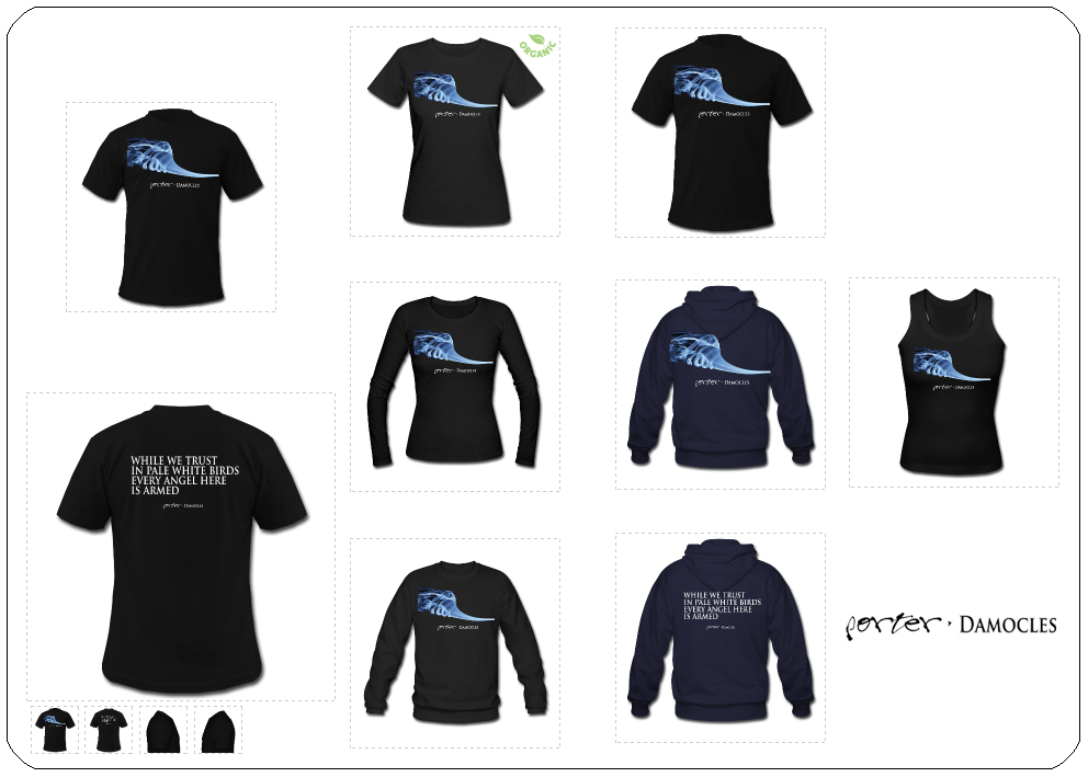 Liebe Freunde der alternativen Musik – vom Schreiben kann ich natürlich genauso wenig leben, wie vom Musik machen, (oder Malen, oder … 🙂 aber auch hier offenbart sich mir und meiner „kleinsten Big-Band der Welt“ ein innerlicher Zwang zum unaufhaltsamen Weitermachen. Und so kommt es, dass gerade die nagelneuen Band-Shirts, Longsleeves und Co. zur aktuellen CD „Damocles“ meiner wundervollen und heißgeliebten Alternative-Rockband PORTER erschienen sind.